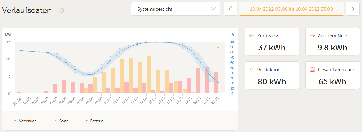 Hier sieht man auch, dass der Speicher voll war und am Nachmittag sehr viel an Ertrag direkt ins Netz geliefert wird.