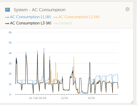 Im Detail nochmal die Leistungsaufnahme über den Tagesverlauf. Eindeutig ist die Grundlast während der Nachtstunden zu erkennen.